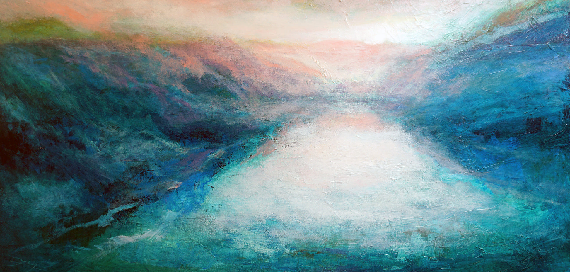 "Brumas No. 31" invites the viewer into a serene and expansive landscape where deep blues, teal greens, and soft pinks flow seamlessly, evoking a sense of tranquility and introspection. The cool tones blend together, creating the illusion of mist enveloping a calm body of water that stretches toward the horizon. The subtle play of light suggests the first glow of dawn or the final moments of twilight, capturing a moment of stillness that feels both eternal and fleeting.