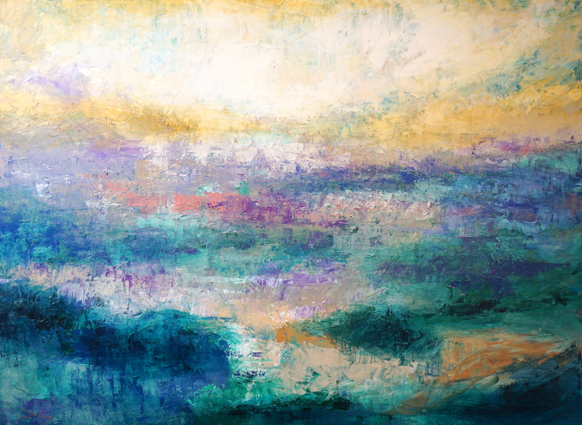 The "Brumas (Mist)" series belongs to the style known as 'Contemporary Landscape.' In it, the transitions of color and texture are explored to capture the atmosphere and movement in the landscape.