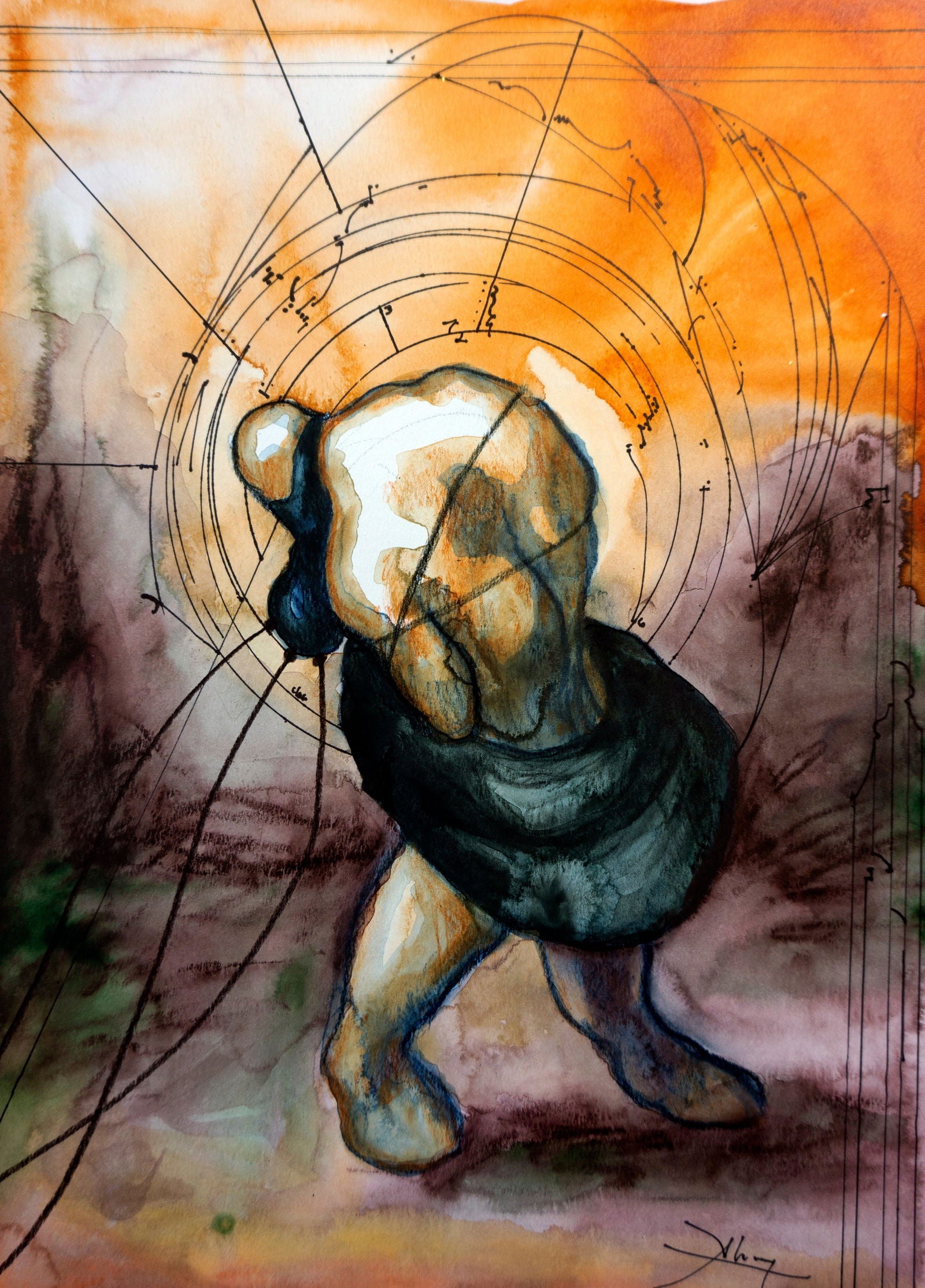 The 'Mecanikalgia' series is a visual representation of a crucial section of 'The Parable,' a poetic and philosophical narrative that I have been developing throughout my life. In this part of the story, Man is connected to a machine by Adam and Eve, symbolizing the forced and painful integration of humanity with technology and mechanization. These works explore themes of alienation, oppression, and the loss of identity in a world dominated by machinery.